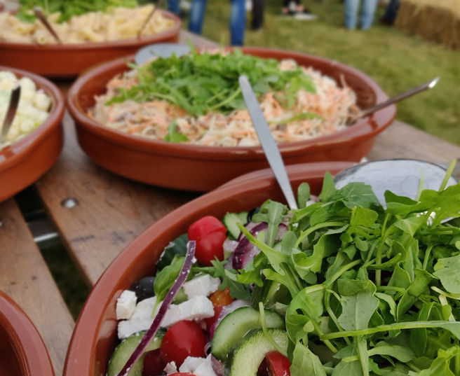 • verse salades, verse friet, stokbrood met kruidenboter en sausen